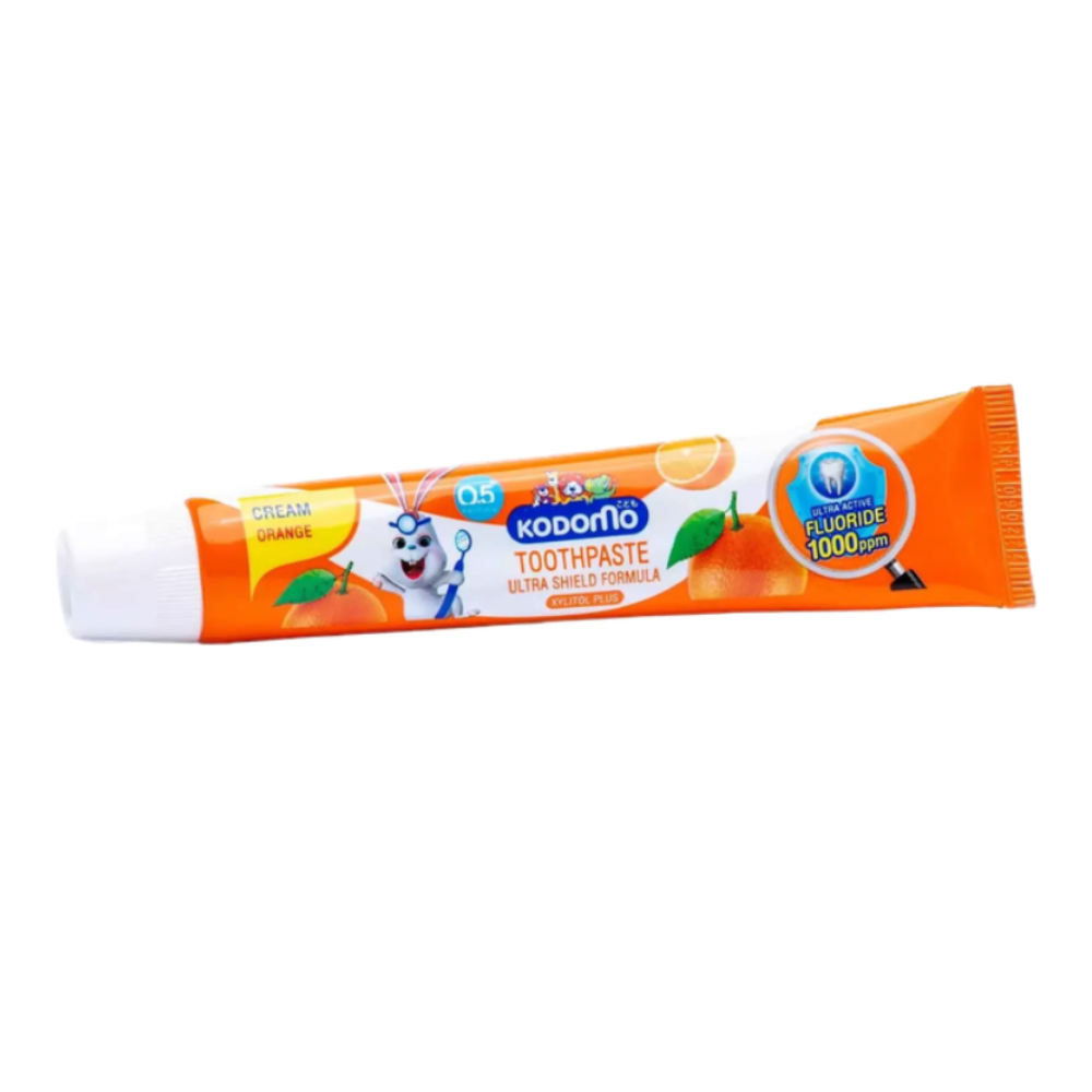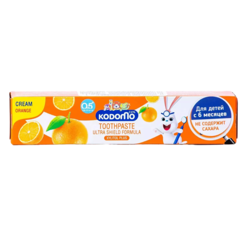 Зубная паста имеет кремовую текстуру, обладает вкусом и ароматом апельсина. Не содержит сахара.
