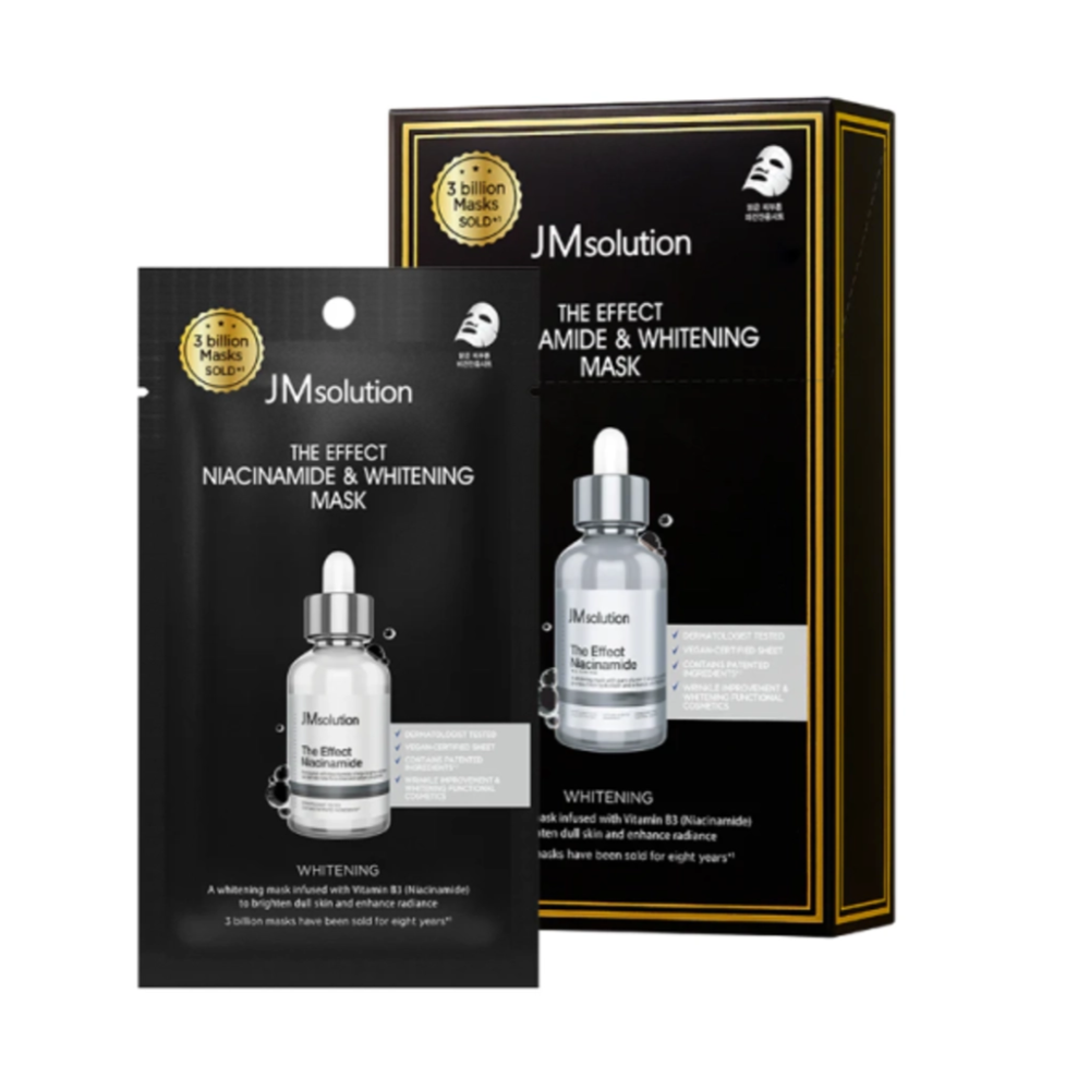 Отбеливающая тканевая маска JMsolution The Effect Niacinamide & Whitening Mask с высокой концентрацией ниацинамида (5%) эффективно выравнивает тон кожи, уменьшает проявления гиперпигментации и придает лицу ровное сияние. Инновационная формула способствует сокращению воспалений и укреплению защитного барьера кожи.